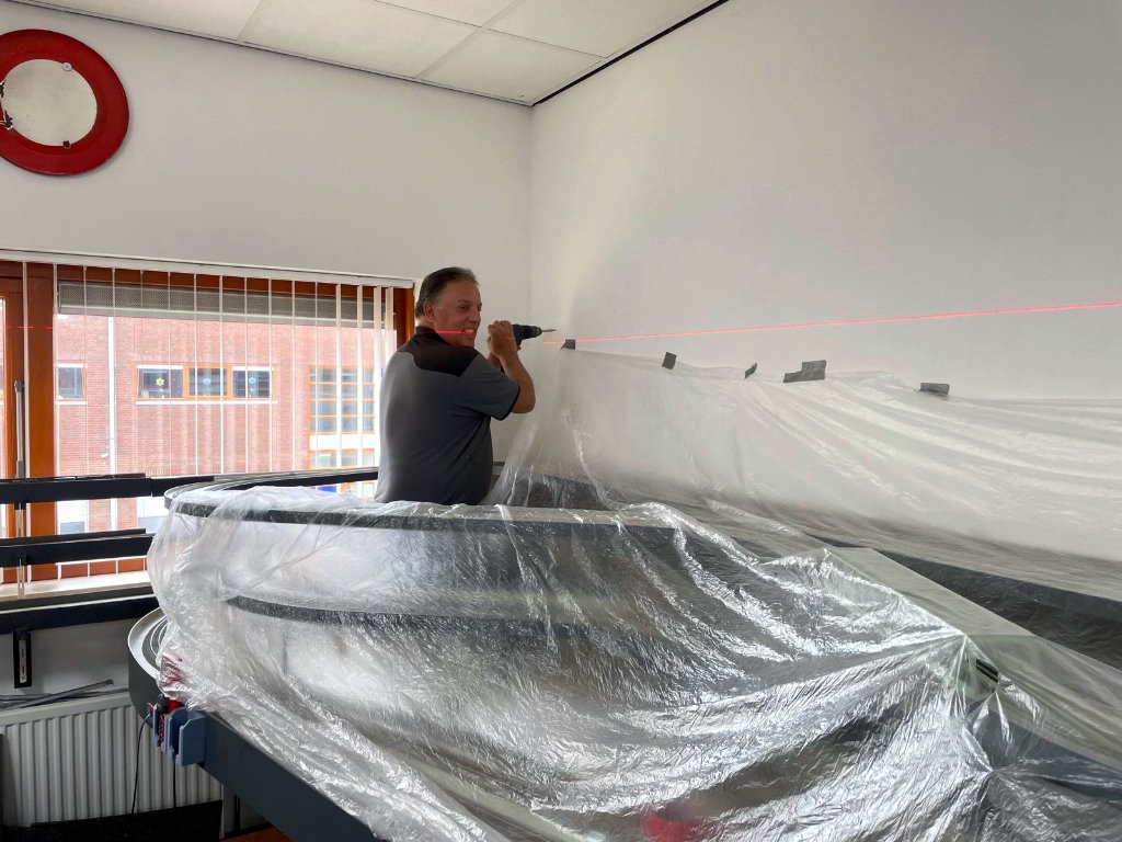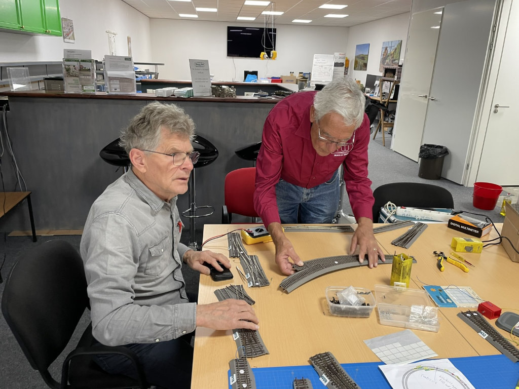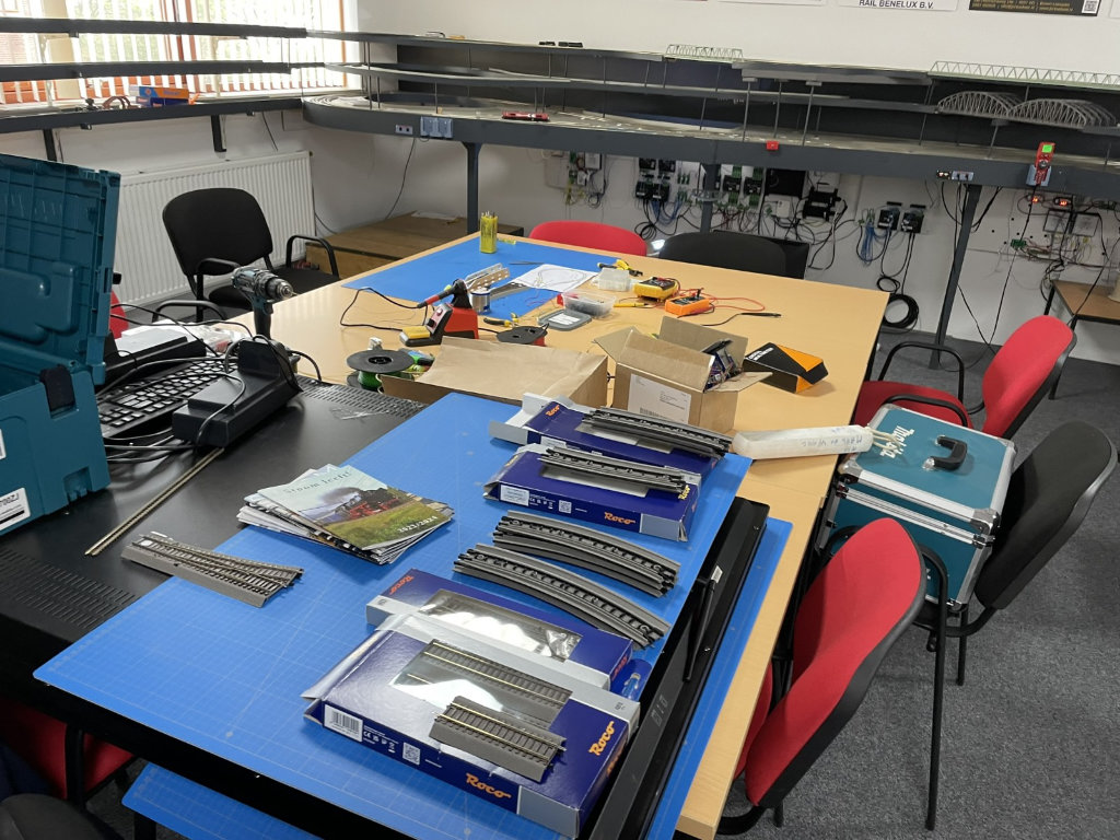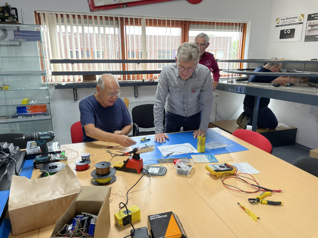 Na eerst de werkwijze besproken te hebben onder het genot van een appeltaartje zijn we gestart! We hebben het linkerdeel van de baan inclusief de grote wisselstraat in z’n geheel gerenoveerd. Dat betekent dat alle oude draden zijn verwijderd. Daarna zijn er nieuwe draden in de juiste kleur nagenoeg onzichtbaar aangesoldeerd.